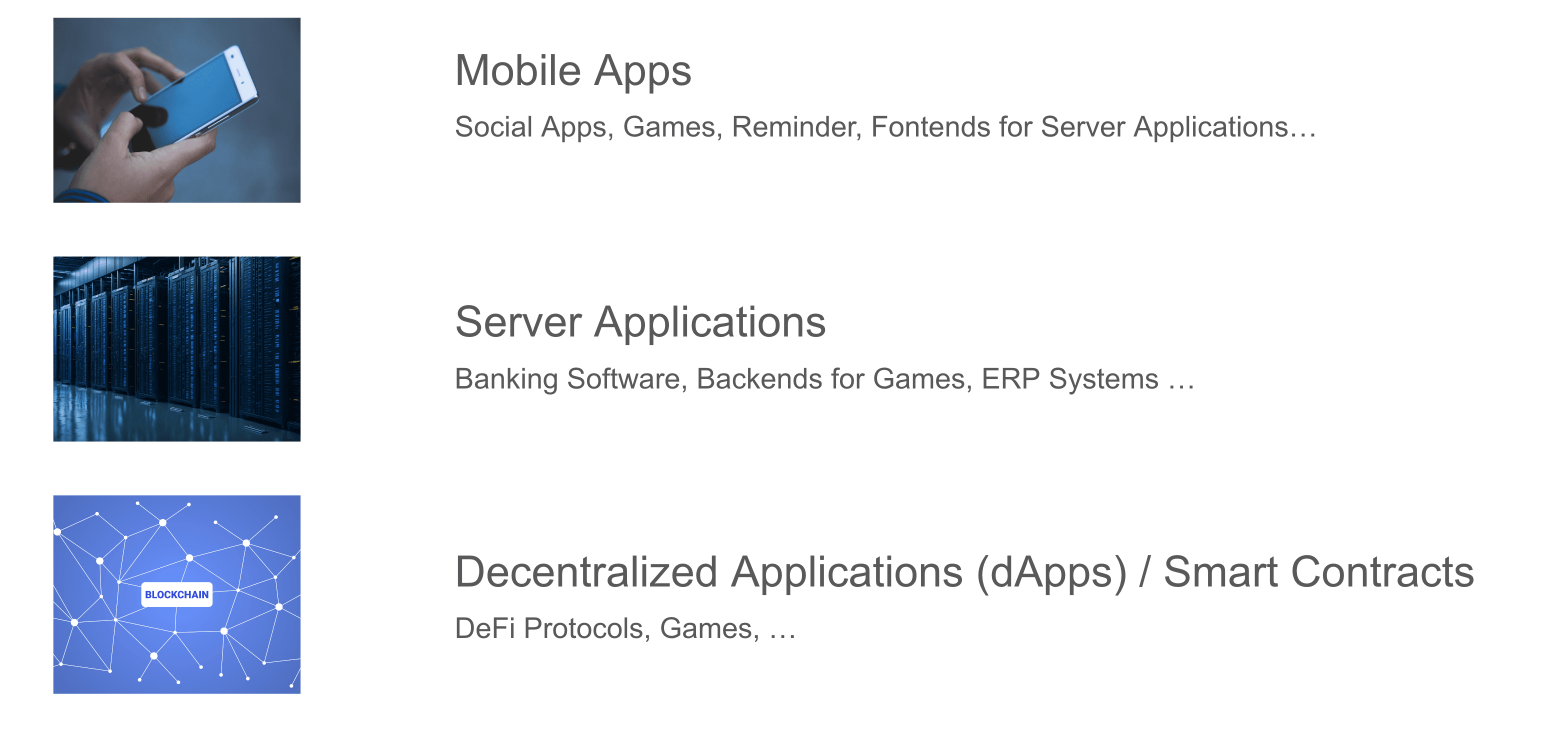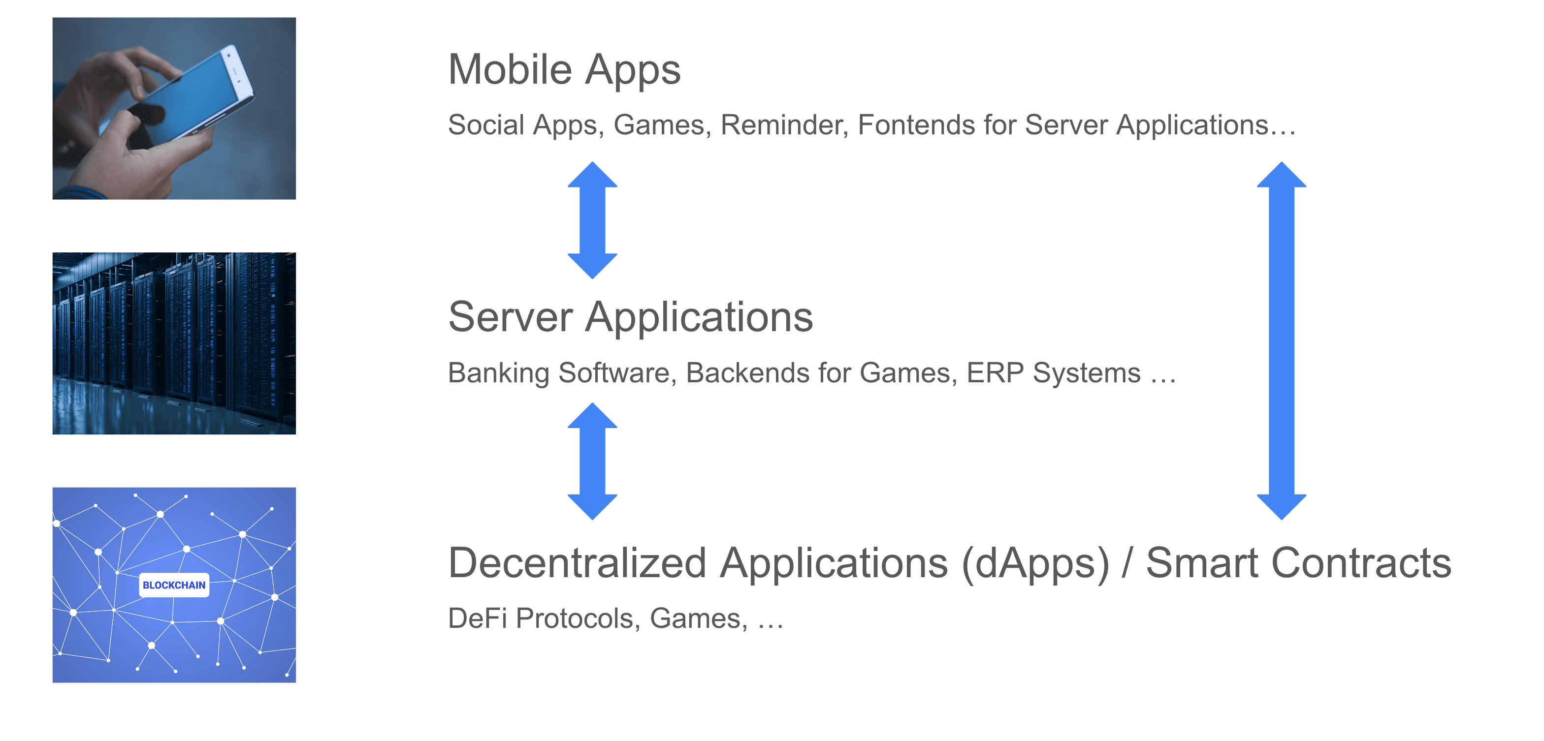 Different types of applications can interoperate across these platforms, enabling a seamless user experience. For instance, a mobile app can interact with a backend running on a web server to fetch or update data. Similarly, the same app could also interact with a smart contract on a blockchain to verify transactions or access decentralized services. This interoperability allows users to benefit from the strengths of each platform, combining the user-friendliness of mobile apps, the processing power of web servers, and the security and transparency of blockchain technology.
